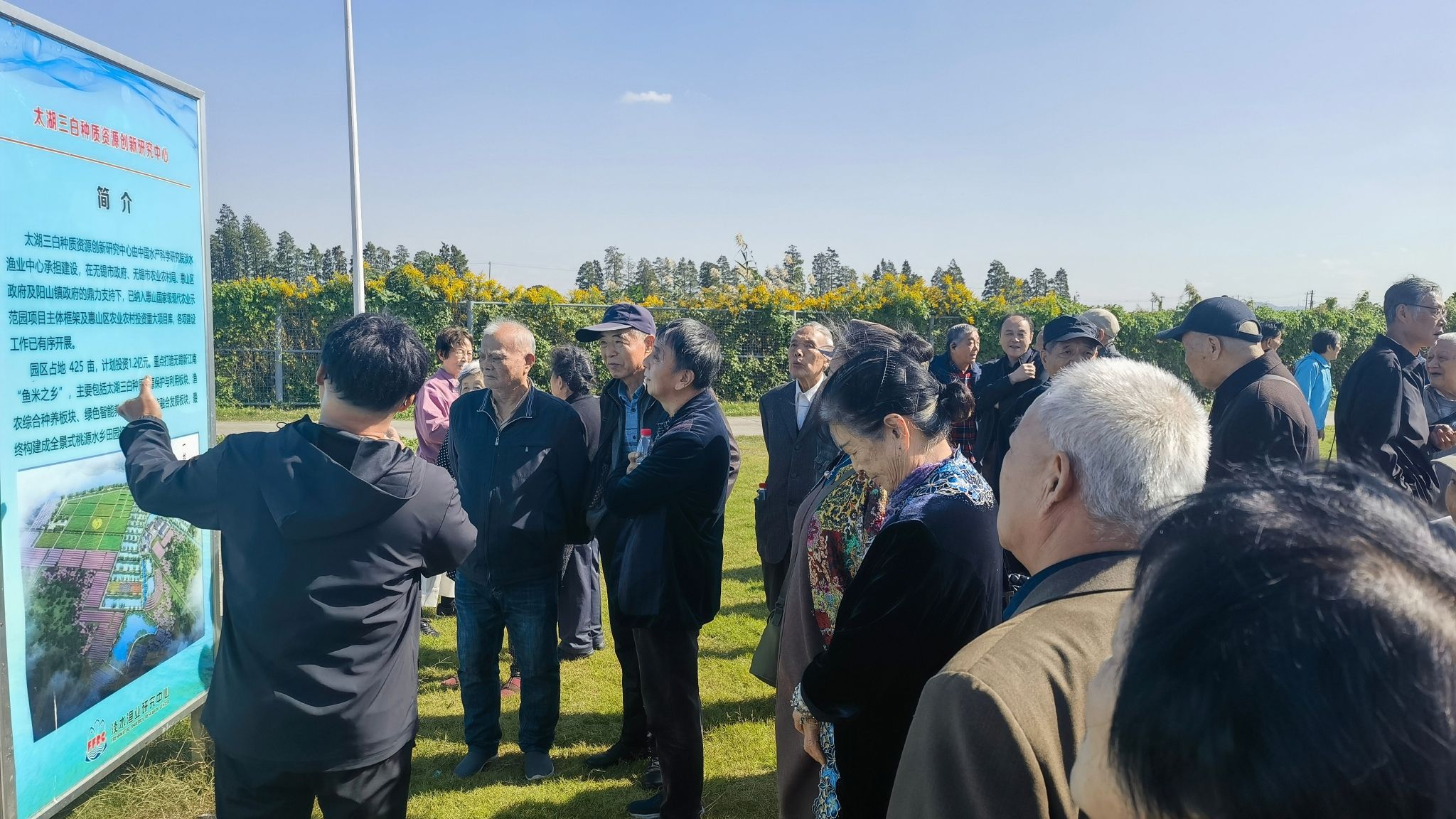 老同志们在基地管理人员陪同下,参观了基地并详细听取了关于基地建设、功能布局、项目进展及示范推广等情况的介绍,了解了基地重点打造现代种业提升、太湖三白种质资源创新中心、渔农综合种养、绿色智能养殖板块等4大的进展情况。老同志们对基地发展情况格外关注,每到一处,都仔细听取工作人员的详细讲解,不时驻足进行交流,现场气氛热烈而融洽。老同志们有着丰富科研经验,对于基地建设和试验实施过程中遇到的问题,有针对性的提出了指导建议。