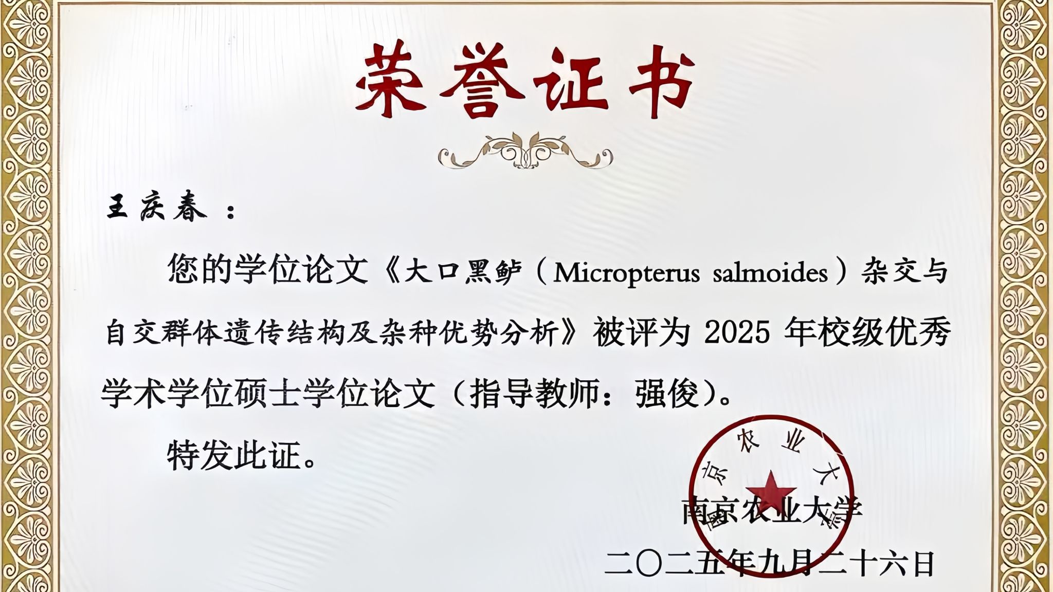 近日,无锡渔业学院2024届硕士研究生王庆春的学位论文《大口黑鲈(Micropterus salmoides)杂交与自交群体遗传结构及杂种优势分析》获评南京农业大学2025年校级优秀学术学位硕士学位论文。