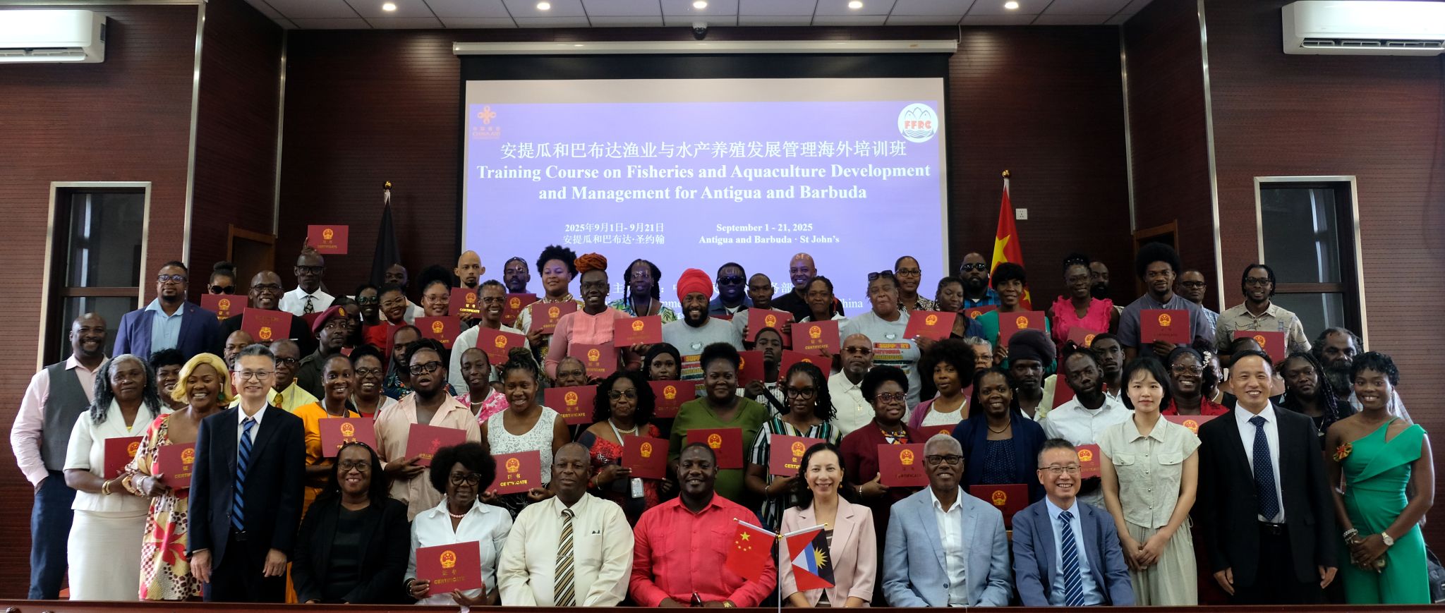 近日,由商务部主办、淡水渔业研究中心承办的“安提瓜和巴布达渔业与水产养殖发展管理海外培训班”在安提瓜和巴布达首都圣约翰顺利结业。安提瓜和巴布达农业、土地、渔业与蓝色经济部部长安东尼·史密斯,对外合作事务大使迪恩·乔纳斯,蓝色经济局局长安路易斯·希尔,中国驻安提瓜和巴布达一等秘书常云,淡水中心党委委员朱健研究员等出席结业典礼。