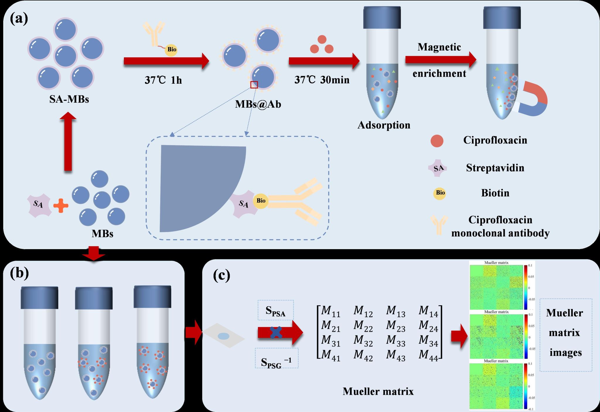 团队联合清华大学,成功研发了免疫磁分离与偏振分类计数协同作用实现双模式分离的第三代快速定量方法,使痕量抗生素残留的检测在检测限和分析时间上均得到显著改善。团队将合成的免疫磁微球(MBs@Ab)通过ResNet34图像识别加以区分。系统优化多比例MBs@Ab偶联条件,得到偏差系数(λ)0.14,在1mg磁珠对应10μg抗体时,偶联效率最高可达92.74%。MBs@Ab对环丙沙星(CIP)表现出特异性吸附,1mg材料可选择性结合1.5ngCIP,并在混合抗生素体系中得到验证。磁分离使预处理时间缩短至2min以内,Mueller矩阵显微镜获取MBs、MBs@Ab及MBs@Ab@CIP的偏振图像。结合混淆矩阵验证的偏振参数分类计数显示预测准确率高,总体准确率超过85%。建立的CIP定量曲线(y=0.052+0.87x,R2=0.96)可在30min内实现检测限0.07μg/L的快速检测,回收率为88%-117.18%。该研究提出的磁-光集成策略为快速定量检测技术提供了有价值参考。