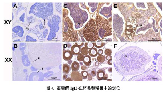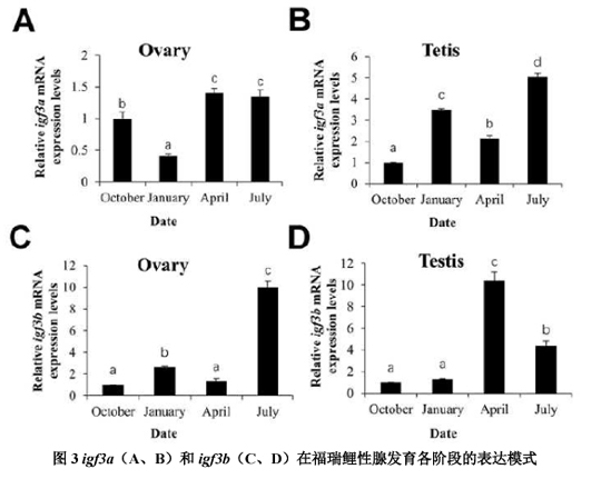 自从胰岛素样生长因子3(Igf3)在鱼类卵巢中被发现以后,其在性腺发育中的作用开始受到业界关注。目前,仅在斑马鱼、尼罗罗非鱼和斜带石斑鱼中报道过Igf3。淡水渔业研究中心水产遗传育种研究室董在杰研究员领衔的课题组以新品种“福瑞鲤”为材料,开展了igf3基因及其功能的研究。 通过实验研究,从福瑞鲤中克隆得到两种类型的igf3基因—igf3a和igf3b。igf3a全长为707bp,包含618bp的开放阅读框(ORF)、47bp的5'非编码区和42bp的3'非编码区,共编码205个氨基酸;igf3b全长1153bp,包含597bp的开放阅读框(ORF)、47bp的5'非编码区和509bp的3'非编码区,共编码198个氨基酸。igf3基因的序列与igf1和igf2一样含有B、C、A、D、E五个结构域。igf3a和igf3b序列与igf1和igf2序列的相似性很低,与igf1的相似性为20.49%和20.71%,与igf2a的相似性为25.35%和25.94%,与igf2b的相似性为26.07%和25.71%。鲤Igf3氨基酸的同源性与斑马鱼最高,为72%。进化树分析显示,鲤igf3先与斑马鱼聚类,再与其他硬骨鱼类聚类。igf3基因广泛表达于鲤各组织,其中在血液和性腺中的表达量最高,在皮肤、脾脏、肠、肾脏、肝脏、脑、心脏和肌肉中表达量依次降低。在性腺发育阶段,igf3a mRNA在成熟期和衰退期的卵巢中表达量最高,在衰退期的精巢中表达量最高;igf3b mRNA在衰退期的卵巢和成熟期的精巢中表达量最高。Western免疫印迹在精巢中检测到两条相应分子质量为21 kDa和34 kDa大小的条带,在卵巢中没有条带检出。Igf3蛋白定位于卵巢的层粒细胞细胞和睾丸的精原细胞和精子细胞。17β-炔雌二醇(E2)处理能提高卵巢和精巢igf3 mRNA的表达量。这些研究结果表明,igf3基因在鲤性腺发育中起着重要的作用。 该研究结果所形成的论文“A Novel igf3 Gene in Common Carp (Cyprinus carpio): Evidence for Its Role in Regulating Gonadal Development”已在PLoS ONE (IF3.057)上发表(doi:10.1371/journal.pone.0168874)。