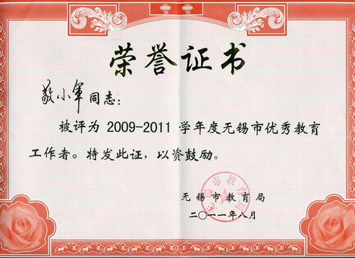 日前,淡水中心教育培训处助理敬小军同志被无锡市教育局授予 “2009—2011学年度无锡市优秀教育工作者”荣誉称号。 该同志在2009-2011学年度教学任务中,注重教学方式的创新和发展,有力推进了无锡渔业学院教学实验室的规划和建设工作;同时在完成承担的援外培训项目过程中,出色完成了项目管理、教学和翻译工作,为我国援外培训事业做出了积极贡献。 中心广大职工,特别是青年职工要以敬小军同志为榜样,立足本职岗位,勤奋工作,创先争优,为中心的发展做出更大贡献。