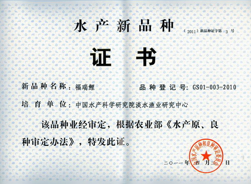 近日,农业部发布公告,我中心培育的鲤新品种—福瑞鲤通过全国水产原种和良种审定委员会的审定,获得了水产新品种证书,这是继建鲤之后,中心培育的又一鲤新品种。 福瑞鲤是以水产遗传育种研究室副主任董在杰研究员为首的研发团队,以建鲤和野生黄河鲤为基础选育群体,借助PIT标记技术,运用数量遗传学BLUP分析和家系选育等综合育种新技术,以生长速度为主要选育指标,经1代群体选育和连续4代BLUP家系选育获得的鲤新品种。经连续几年在山东、江苏、四川、云南、河南、吉林、宁夏、重庆等地进行的生产性养殖对比试验表明,福瑞鲤的生长性状良好,具有生长速度快(比普通鲤鱼提高20%以上,比建鲤提高13.4%)、体型好(体长/体高约3.65)、饵料系数低(系数在1左右)等特点,适宜在全国淡水水域中养殖。 在福瑞鲤的研制过程中,董在杰研究员的研究团队同时建立了一种快速、高效的鲤育种技术,其中最突出的创新点是:借助PIT标记技术和家系选育,运用数量遗传学BLUP分析方法计算每尾存活个体的估算育种值并应用于亲本选择,显著提高了育种效率;在选育过程中,通过PIT标记对每尾鱼进行识别和追踪它们的亲缘关系,控制近亲交配,避免近交衰退。运用这一新的育种技术可以对育种对象实现长期选育。